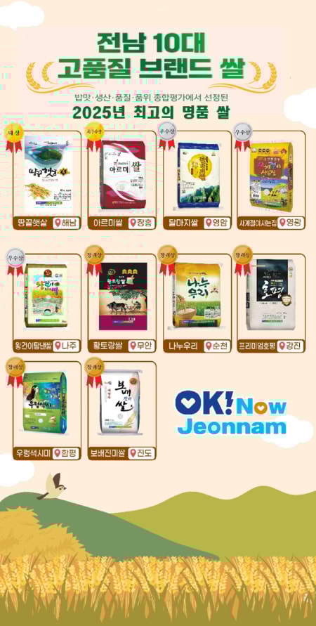 △최우수상 장흥 아르미쌀 △우수상 영암 달마지쌀, 영광 사계절이 사는 집, 나주 왕건이 탐낸 쌀 △장려상 무안 황토랑쌀, 순천 나누우리, 강진 프리미엄호평, 함평 우렁색시미, 진도 보배진미쌀이 선정됐다.