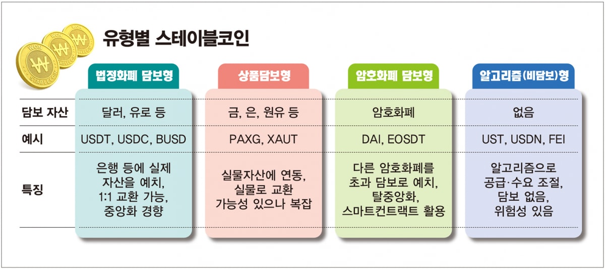 암호자산 담보형은 이더리움 등 디지털 자산을 초과담보 형태로 맡기고 스마트 계약을 통해 발행된다. 대표 사례는 DAI(MakerDAO)이며 탈중앙화 수준이 높다는 장점이 있지만 담보 자산의 급격한 가격 변동 시 청산 위험이 존재한다. 알고리즘형은 별도 담보 없이 수요·공급 조절 알고리즘으로 가격을 유지하는 구조다. 테라USD(UST)가 대표적이었으나 2022년 붕괴 사례 이후 가장 고위험 구조로 분류된다. 최근에는 알고리즘과 담보 방식을 혼합한 Frax(FRAX) 같은 하이브리드형도 등장하고 있다.