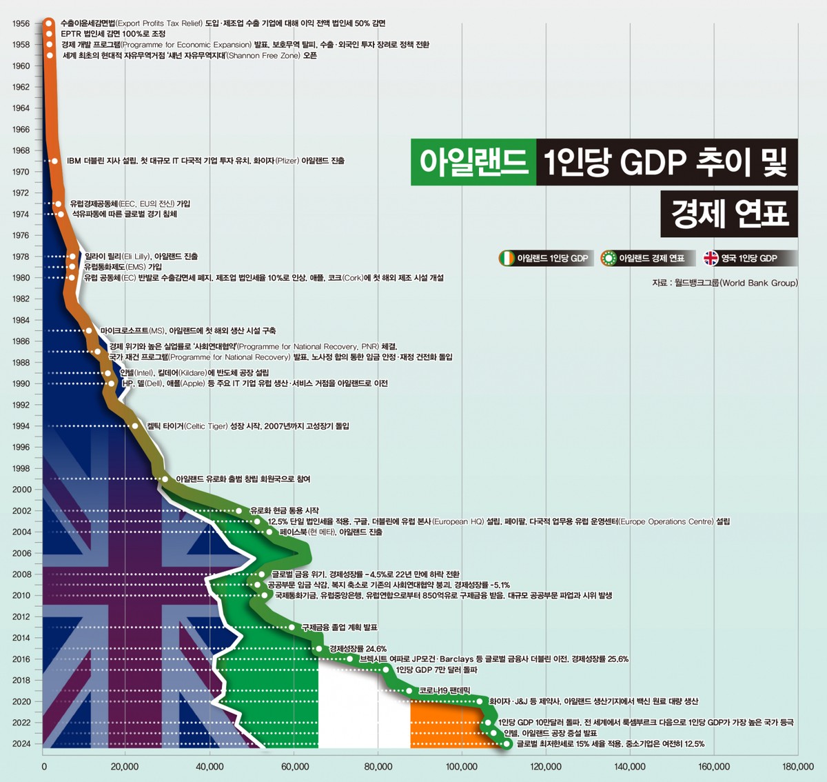 800년 넘게 영국의 식민지였던 아일랜드는 이제 영국을 넘어서는 '작지만 강한, 초록 섬'이 됐다. 지난해 아일랜드의 1인당 국내총생산(GDP)은 10만달러를 훌쩍 넘어 세계 2위에 올랐다. 그 사이 영국은 2000년대 초반부터 5만달러 수준에 머물러 있다.