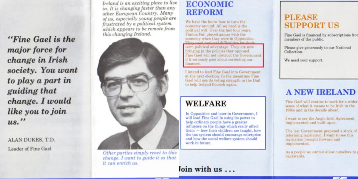 1987년 9월, 아일랜드 더블린의 교외 지역인 탈라트의 상공회의소. 아일랜드의 제1야당인 피네 게일(Fine Gael)의 신임 당수 앨런 듀크스(Alan Dukes)는 연단에 올라 이같이 선언했다. 수십년 동안 내전의 상흔으로 여야간에 불신과 적대만 쌓여온 상황에서 이 한마디는 역사의 물줄기를 바꿨다.