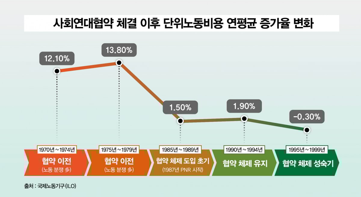 사회연대협약의 효과는 기대 이상이었다. 공공·민간 기업은 임금을 사실상 동결하는 데 성공하면서 비용 구조가 크게 안정됐다. 임금 상승 압력이 컸던 1970년대에 단위노동비용(노동자 임금 / 노동생산성) 증가율이 각각 ▲1970~1974년 12.1% ▲1975~1979년 13.8%에 달했지만 사회협약 체제 도입 이후에는 ▲1985~1989년 1.5% ▲1990~1994년 1.9% ▲1995~1999년 –0.3%로 가파르게 낮아졌다. 국내총생산(GDP)에서 임금이 차지하는 비중도 1987년 71%에서 2000년 56.9%로 크게 줄었다.