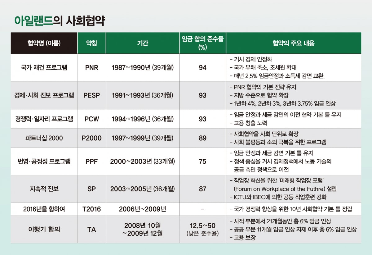 아일랜드의 사회연대협약은 1987년부터 2009년까지 평균 3년 단위로 갱신돼 총 여덟 차례의 사회협약으로 발전했다. 80년대 중반까지만해도 연간 100건이 넘는 노동쟁의가 발생하던 노조공화국 아일랜드는 이 과정을 통해 경제 도약의 든든한 발판을 마련했다. 임금 안정과 세제 개혁을 통한 고용 확대와 외국 자본의 투자 유치는 국가 경쟁력을 끌어올렸고 '켈틱 타이거'라 불린 고속 성장을 견인했다.