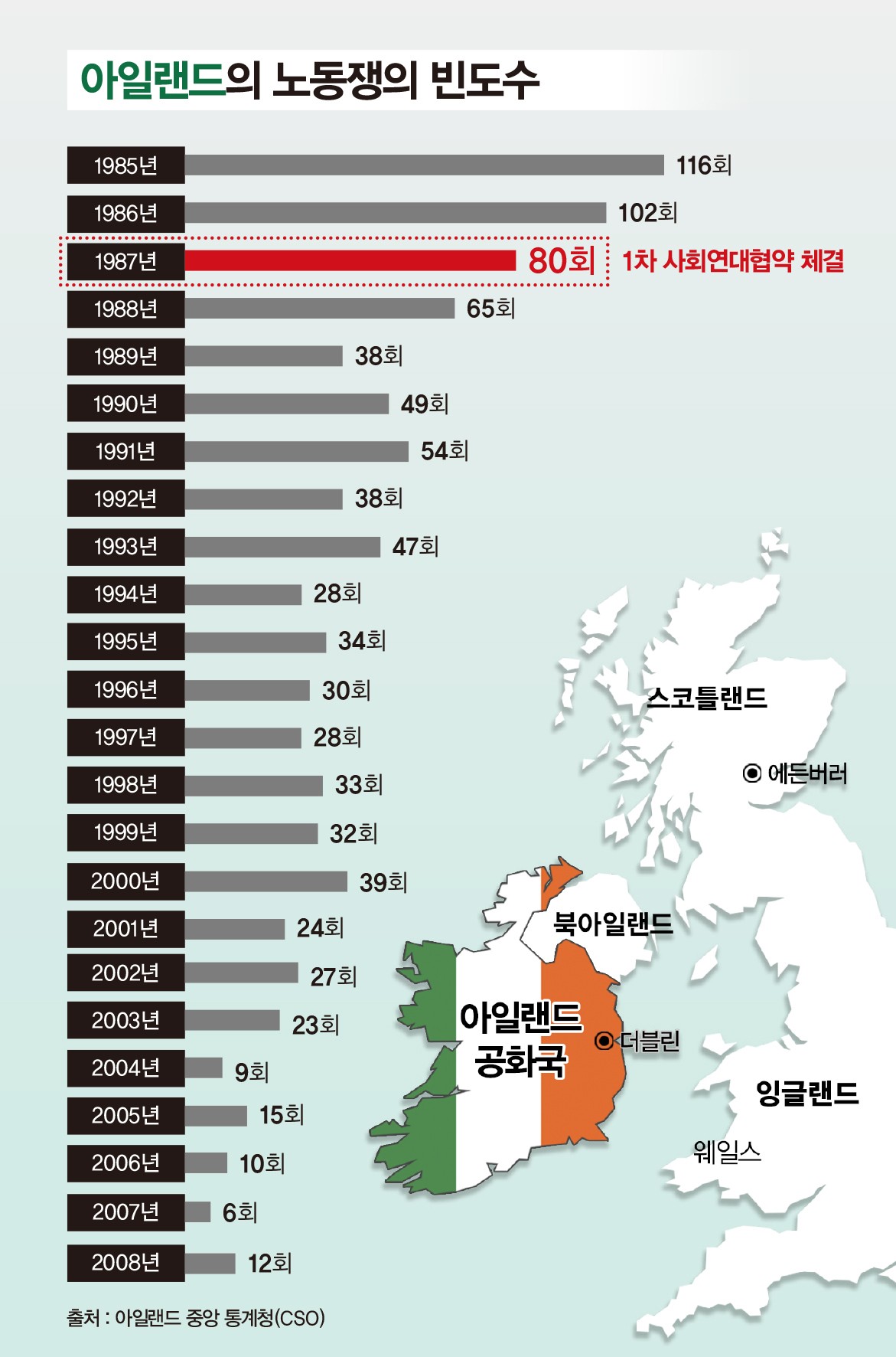 아일랜드는 노조공화국으로 불릴 정도로 오랫동안 극심한 노사 갈등을 겪었다. 그러나 사회연대협약(Social Partnership)을 맺은 뒤 상황은 크게 달라졌다. 1986년 102건에 달했던 노동 쟁의는 1987년 첫 번째 협약인 '국가 회복을 위한 프로그램'(PNR)이 도입되면서 불과 3년 만인 1989년 38건으로 줄어들었다. 60% 이상 감소한 것이다. 이후 1990년대에 들어서도 분쟁 건수가 연평균 40건 이하로 떨어지며 안정적인 수준을 유지했다.