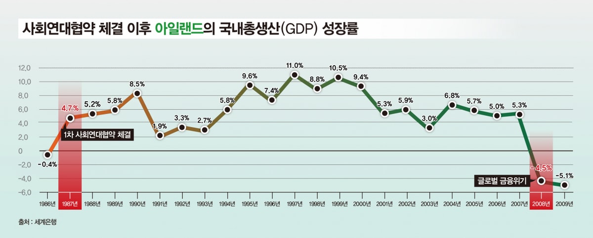 한반도 면적의 70%에 불과한 이 작은 섬나라는 어떻게 국가적 위기들을 극복할 수 있었을까. 그 위기 극복 스토리의 근간에는 노사정이 함께 위기를 진단하고 해법을 모색한 '사회협약'이 자리하고 있다. 세계화 시대에 가장 두드러진 성공 사례로 꼽히는 '켈틱 타이거'의 고속 성장도, 금융위기 이후 유럽 국가 중 가장 먼저 구제금융에서 졸업한 기록도 결국 이 사회협약의 힘에서 비롯됐다.
