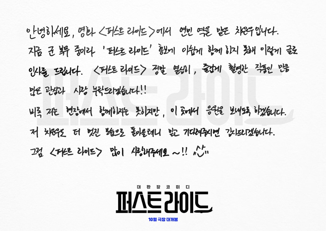또 차은우는 공개된 자필 편지에 "'퍼스트 라이드'는 정말 열심히 즐겁게 촬영한 작품"이라며 "복무 중이라 비록 현장에서 함께하지는 못하지만 이곳에서 응원을 보내도록 하겠다"며 "저 차은우도 더 멋진 모습으로 돌아올 테니 믿고 기다려주시면 감사드리겠다"고 덧붙였다.