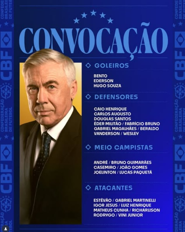 브라질축구연맹(CBF)은 2일(이하 한국시각) 10월 A매치 소집 명단을 공개했다. 브라질은 오는 10일 한국, 오는 14일 일본과 평가전을 치른다. 카를로 안첼로티 브라질 감독은 10월 A매치를 앞두고 최정예 멤버로 선수단을 구성했다. 부상으로 이탈한 하피냐(바르셀로나), 마르키뉴스(파리 생제르맹·PSG), 알리송 베커(리버풀) 등이 제외됐지만 대부분 주축 선수들로 이뤄졌다.