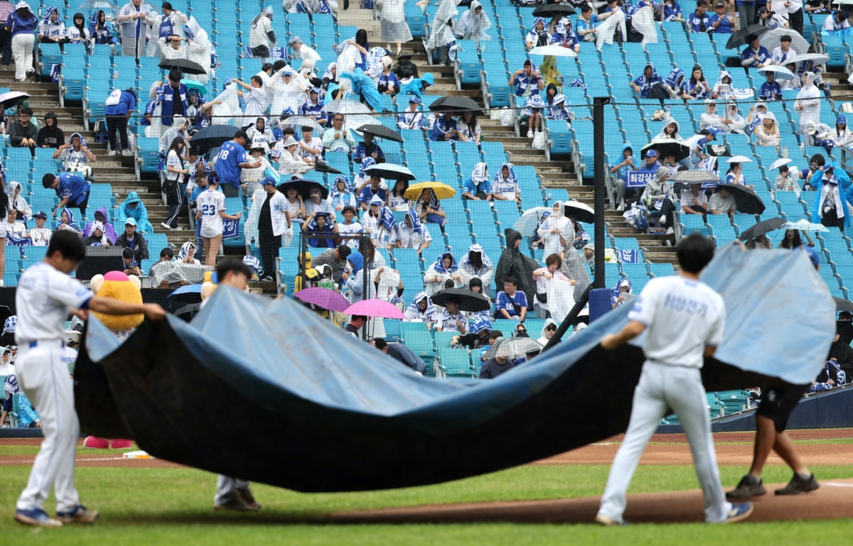 현재는 비가 잦아들면서 방수포를 걷고 그라운드를 재정비하고 있다. KBO 관계자는 "낮 2시45분쯤 경기를 개시하는 것이 목표"라고 했다.
