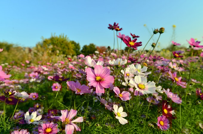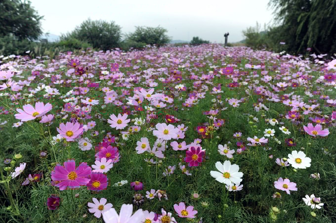 이곳 코스모스 길은 분홍, 아이보리, 자주 등 다양한 색깔의 꽃물결을 이뤄 파란 가을하늘 속 아름다운 풍경을 연출하고 있다.