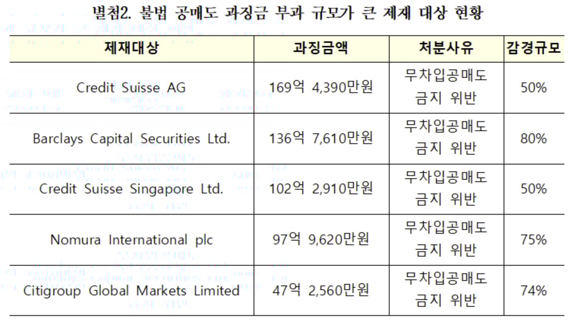 제재 대상의 약 80%는 외국계 금융회사였다. 과징금 부과 금액은 크레디트스위스 AG가 169억 원으로 가장 많았고, 바클레이스캐피털시큐리티즈(136억원), 크레디트스위스 싱가포르(102억원), 노무라인터내셔널(97억원), 씨티그룹글로벌마켓(47억원) 순이었다.