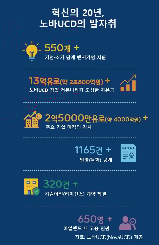 이처럼 단단하게 구축된 공동체와 전방위적 지원 시스템은 곧 스타트업의 성장, 그리고 국가 경제의 발전이라는 성과로 이어졌다. 노바UCD는 개소 이후 20년 동안 550개가 넘는 기업을 성공적으로 지원했다. 이들이 유치한 누적 투자금은 13억유로(약 2조800억원)에 달하며 매각·상장 등 주요 엑시트 가치만도 2억5000만유로(약 4000억원) 이상을 기록했다. 이러한 성과는 고부가가치 중심의 양질의 일자리 창출로도 이어졌다. 현재 노바UCD 지원 기업들은 아일랜드 내에서만 650명 이상의 정규직 고용을 책임지고 있다.