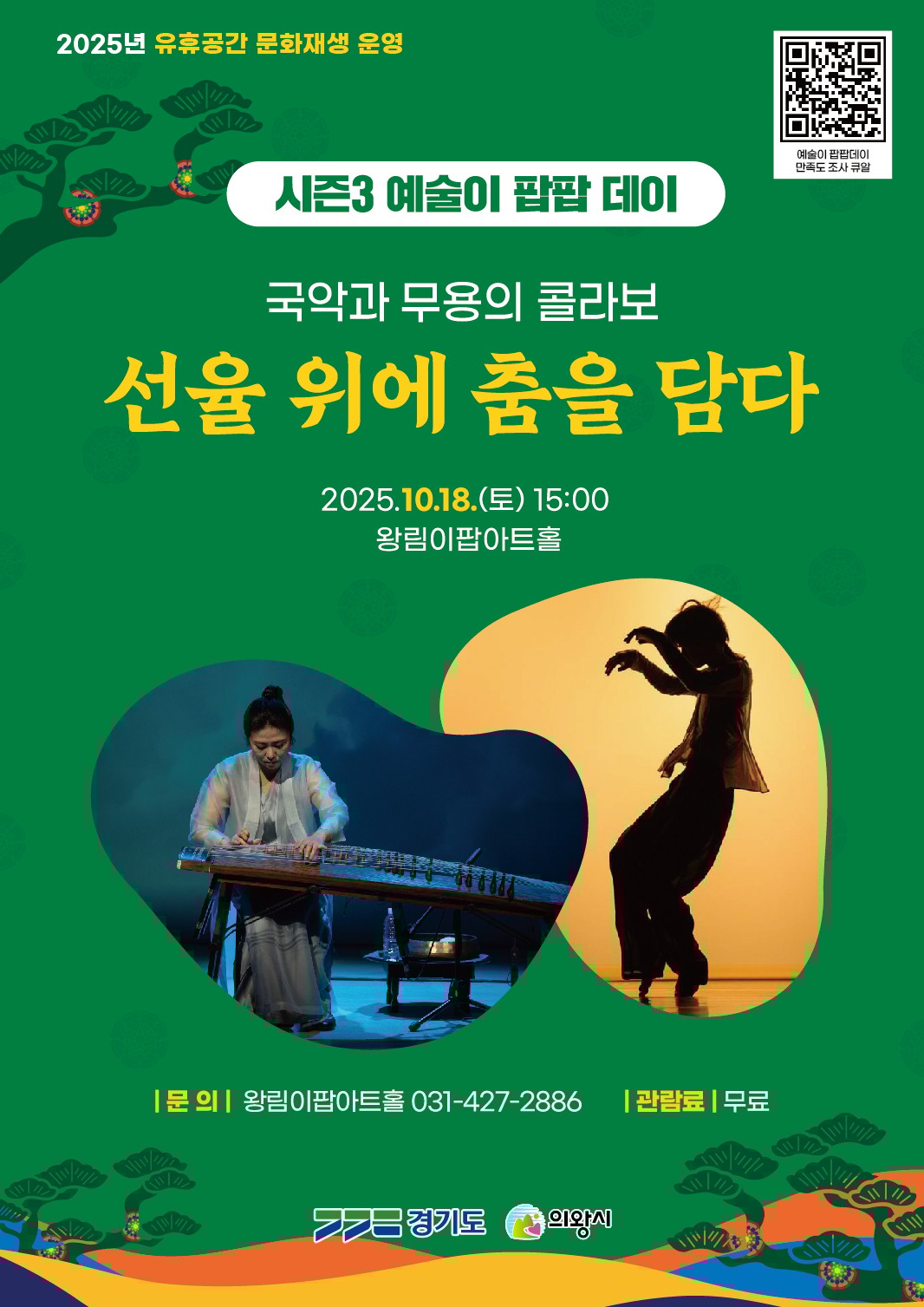 박준우는 전통춤의 기본기를 바탕으로 서정적이면서도 현대적인 움직임을 통해 한국적 정서를 표현할 예정이다. 두 예술가의 협연은 국악과 무용의 경계를 허물고, 전통과 현대가 어우러진 새로운 예술적 콜라보를 선보일 전망이다. 본 공연은 전석 무료로 진행하며, 의왕시 통합예약시스템을 통해 사전 예매 가능하다.