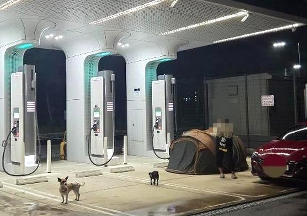 전기차 충전소에 텐트 치고 개 풀어둔 여성… 항의에 "옆에서 해" 버럭