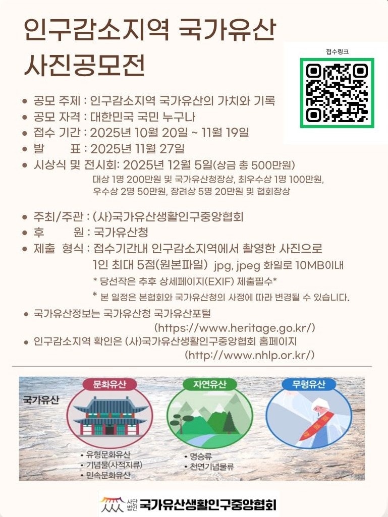 국가유산생활인구중앙협회가 주최하고 국가유산청이 후원하는 '인구감소지역 국가유산 사진 공모전'이 개최된다.