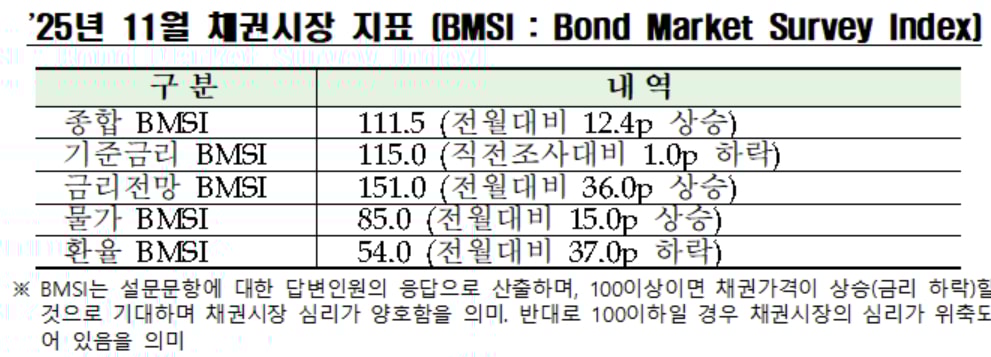 금통위 동결 전망이 우세한 가운데, 정작 채권시장 참여자들의 심리는 크게 개선된 것으로 나타났다. 11월 종합 BMSI는 111.5로 전월(99.1) 대비 12.4포인트 상승했다. BMSI가 100을 넘으면 채권가격 상승(금리 하락)을 기대하는 시장 심리가 양호함을 의미한다.