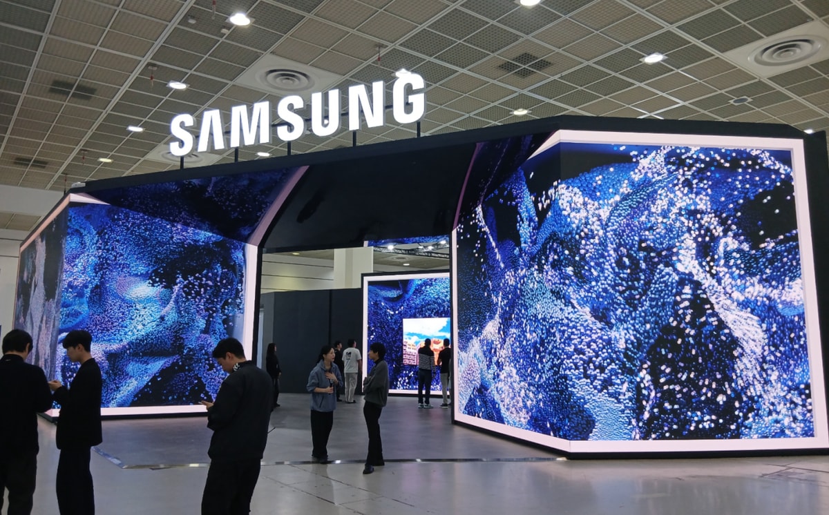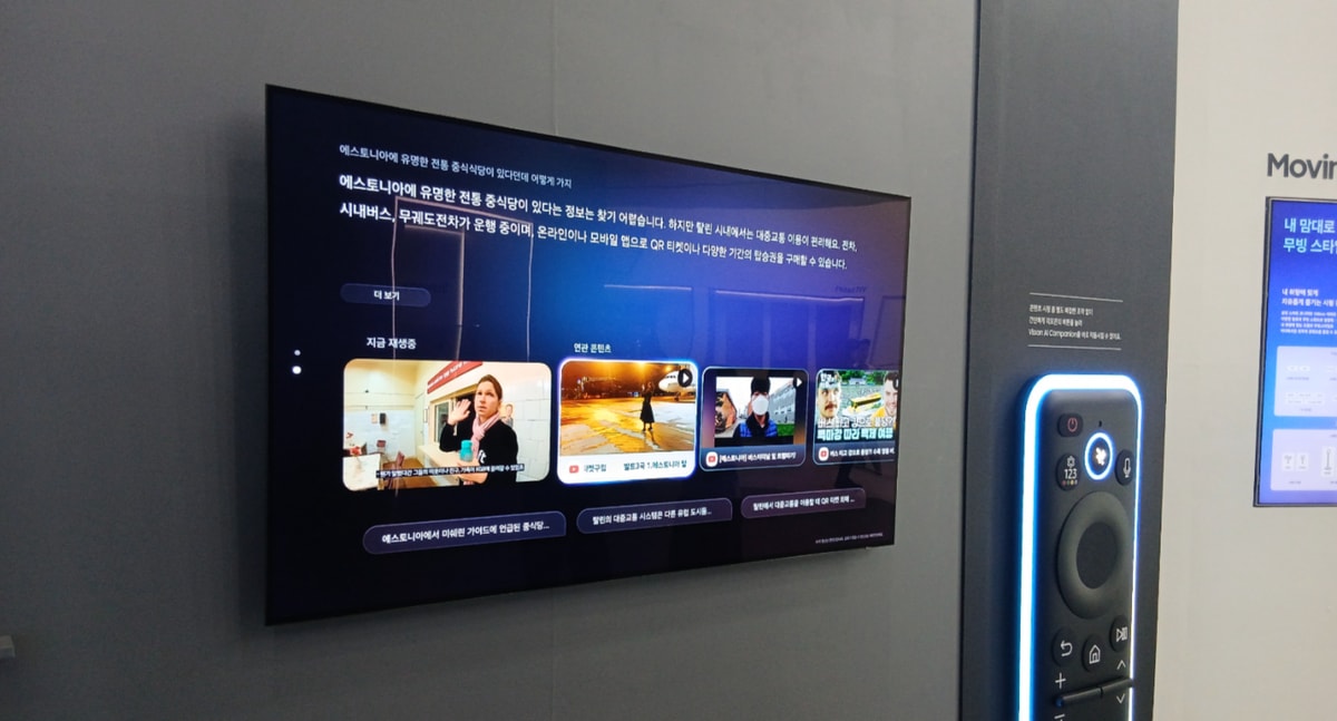 1층 입구 통로를 지나자 삼성전자 부스가 눈에 띄었다. 전시관 입구는 대형 LED를 활용한 미디어 파사드로 구성돼 시선을 끌었다. 부스 안에 들어서자 TV에 예능 프로그램이 나오고 있었다. 회사 관계자는 "리모컨 스피커를 통해 방송 화면에 대해 물어보라"고 말했다. 기자가 "방송 촬영지가 어디야"라고 묻자 화면 상단에는 '발트 3국 중 하나인 에스토니아'라는 답변이 나왔다.