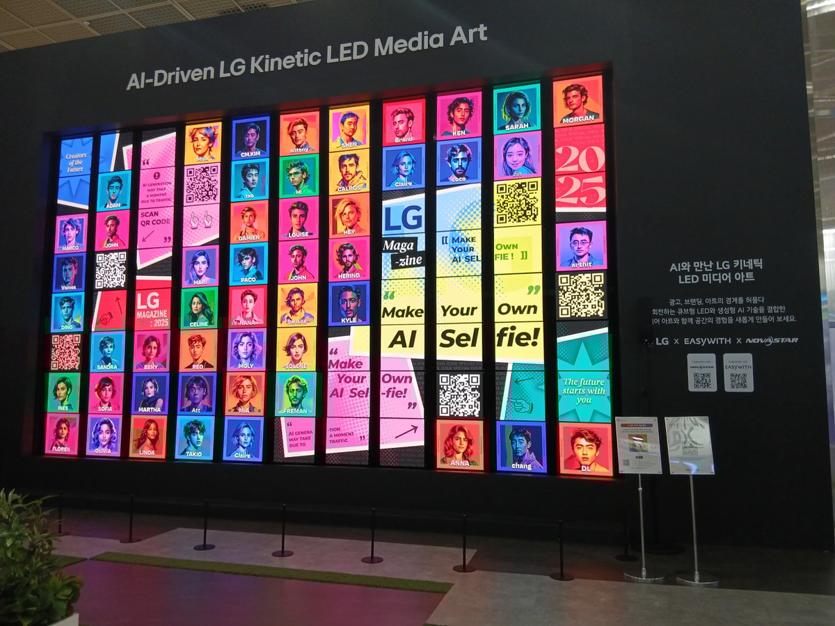 통로 좌측으로 이동하면 LG전자 부스 통로에 있는 'LED 사이니지'가 보였다. 전시장 입구에 위치한 이것은 '키네틱 LED'이다. 전시장 방문객은 QR 코드를 찍고 자신의 얼굴 사진을 업로드하면 LED 화면에 방문객 얼굴이 팝아트 형태로 변형돼 나타난다. 기자도 직접해보니 화면이 바뀌며 팝아트로 구현된 얼굴 그림이 나왔다.