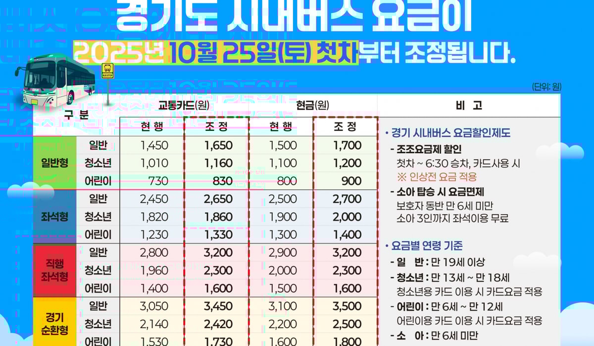 경기도가 오는 25일 첫차부터 시내버스 요금을 조정한다. 2019년 이후 6년 만이다.