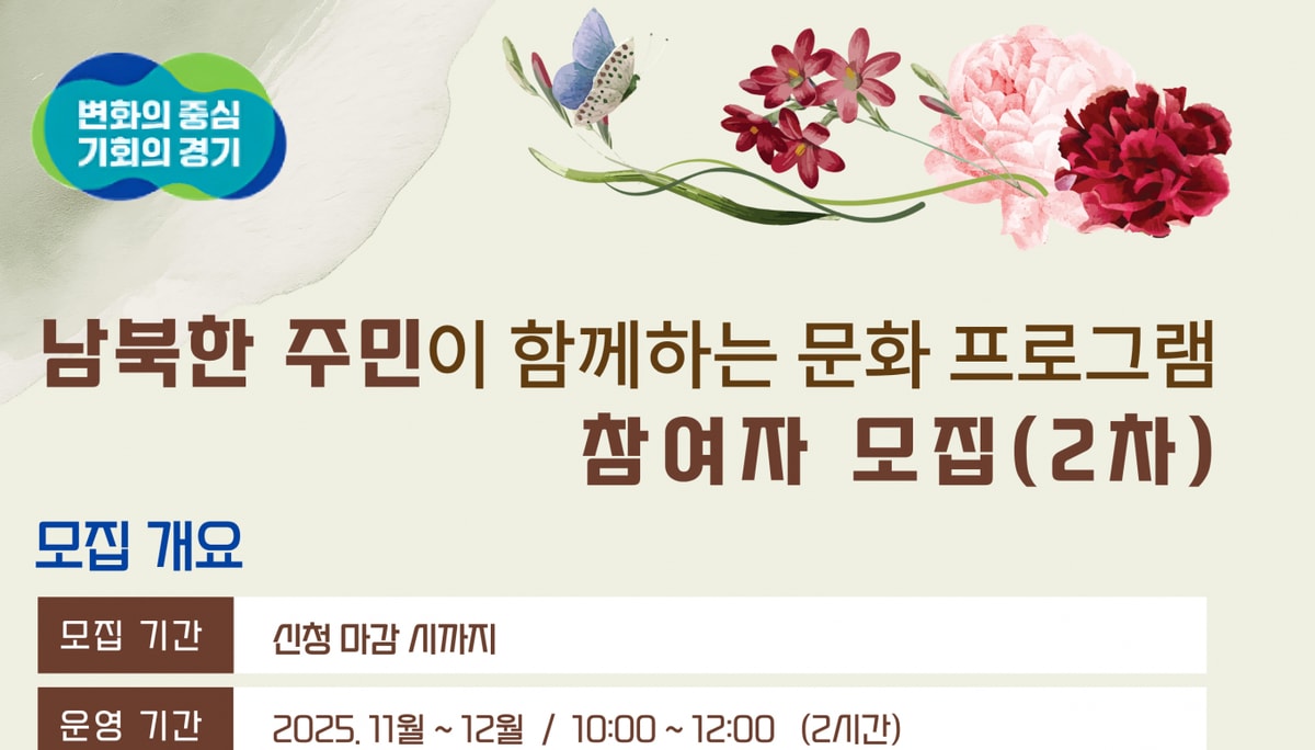 각 과정은 매회 15명씩 선착순 모집하며 수강료는 무료다. 참여를 원하는 도민은 22일부터 홍보 포스터 내 QR코드로 접속해 신청하거나 경기권 통일플러스센터 누리집을 통해 신청하면 된다. 경기도에 거주하는 남북한 주민 누구나 참여 가능하며, 1회만 신청 가능하다.
