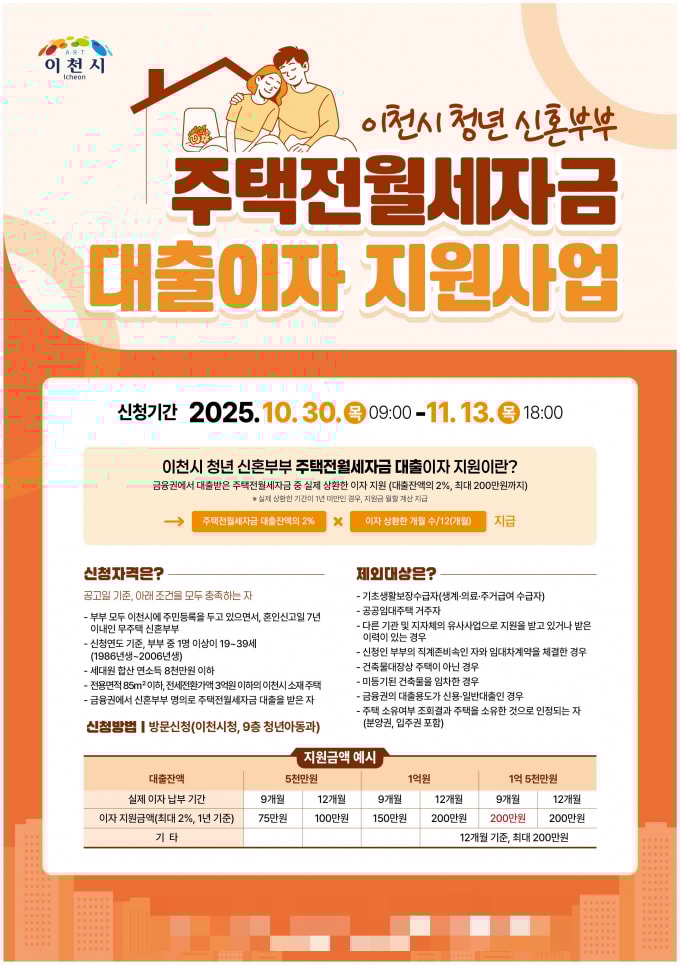 지원대상은 △부부 모두가 이천시에 주민등록을 두고 △연령[부부 중 1명 이상이 19세~39세(1986년생~2006년생)] △소득(세대원 합산 연 소득 8천만 원 이하) △주택(전용면적 85㎡ 이하, 전세전환가액 3억 원 이하의 이천시 소재 주택) △대출조건(금융권에서 신혼부부 명의 주택전월세자금 대출) 등을 모두 만족하는 무주택 신혼부부이다.