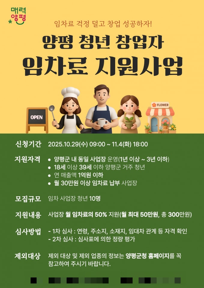 지원 대상은 △양평군에 주소를 둔 18세 이상 39세 이하 △공고일 기준 사업자등록증명 상 개업일 1년 이상 3년 이하 △연 매출액 1억 원 이하 △월 임차료 30만 원 이상 납부 중인 청년 창업자이다. 희망자는 10월 29일 오전 9시부터 11월 4일 오후 6시까지 경기도 일자리 플랫폼 '잡아바'를 통해 온라인으로 신청할 수 있다.