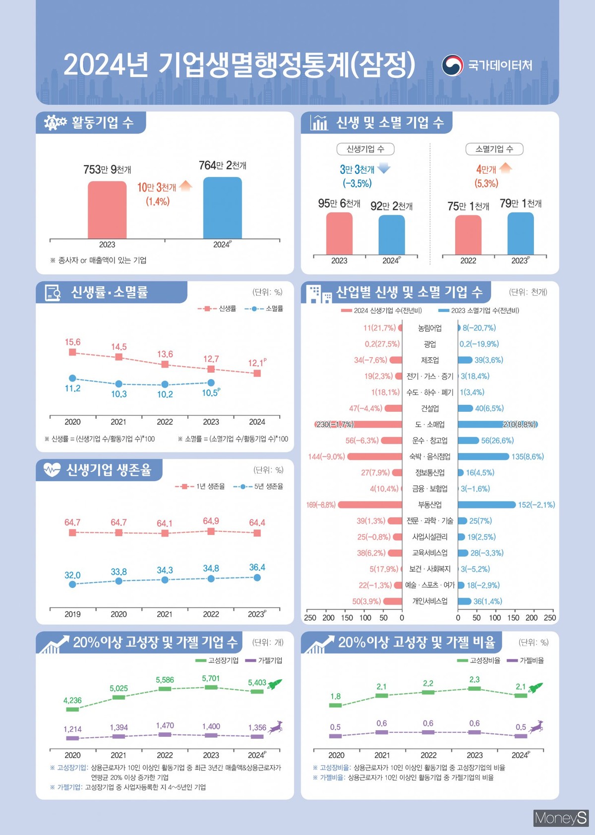 활동기업 중 신생기업은 2만9784개로 전년(3만585개)보다 801개(2.7%)가 감소했다. 2023년 활동기업 중 소멸기업은 2만4633개로 전년(2만4969개)보다 336개(1.4%)가 줄었다.