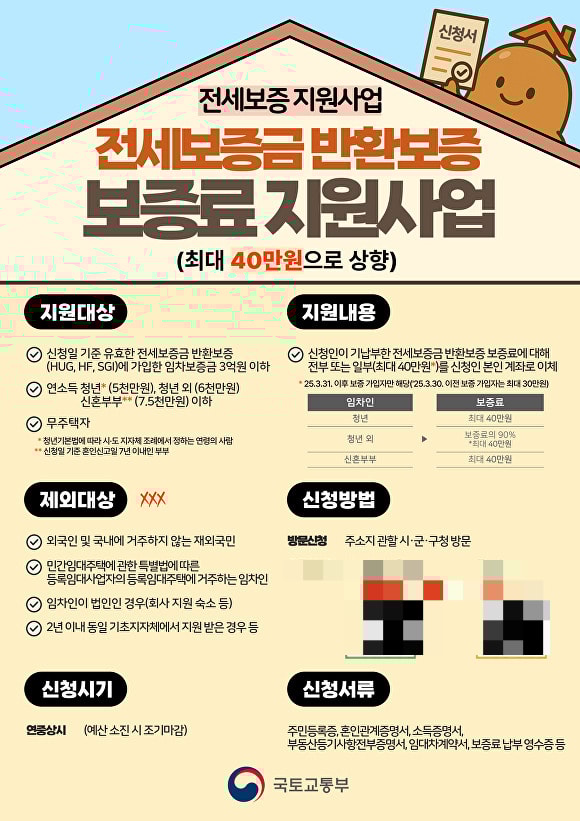 이번 사업은 주택도시보증공사(HUG)와 SGI서울보증 등의 전세보증금 반환보증 상품에 가입할 때 임차인이 납부한 보증료의 최대 40만원을 지원하는 제도다.