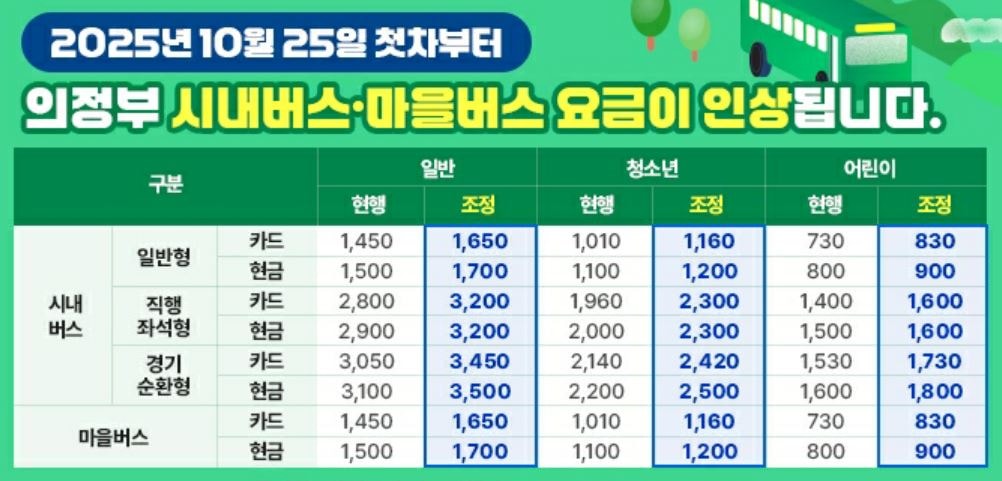의정부시, 25일부터 시내버스·마을버스 요금 인상