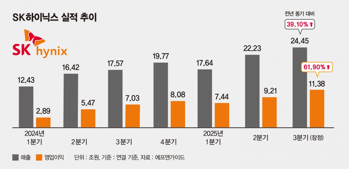 SK하이닉스는 29일 올해 3분기(7~9월) 연결 기준 영업이익이 11조3834억원으로 전년 동기 대비 61.9% 증가했다고 공시했다. 매출은 24조4489억원으로 39.1% 늘었으며, 순이익은 12조5975억원으로 119% 증가했다.