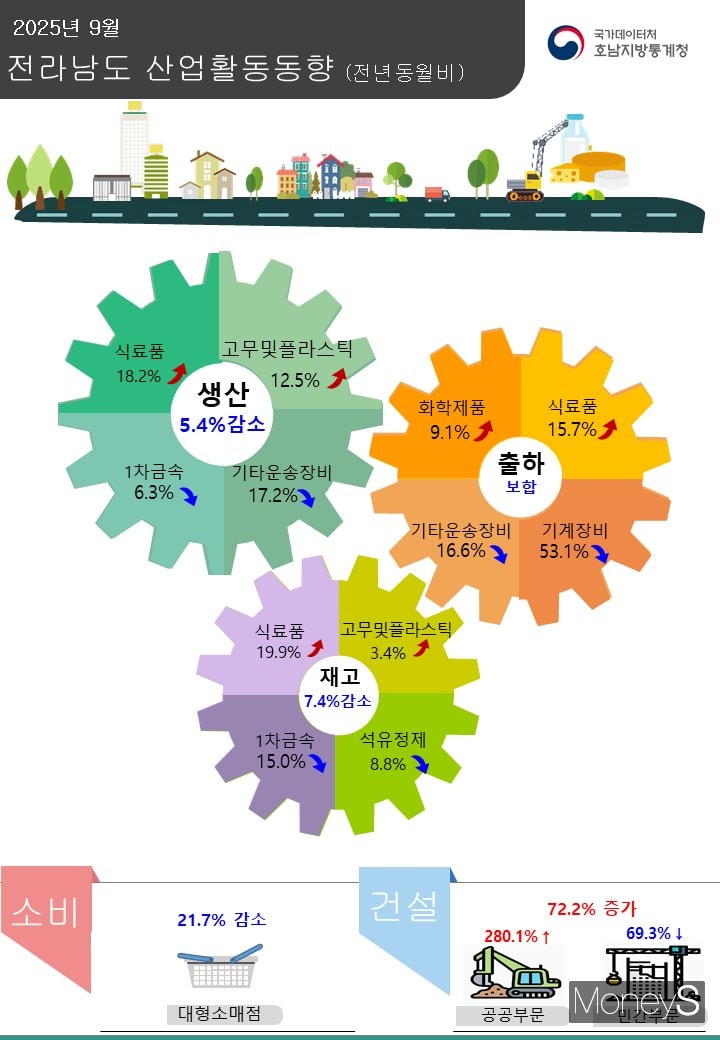 같은 달 광주의 광공업 생산은 지난해보다 28.2%가 증가한 반면 전남은 5.4%가 감소했다.