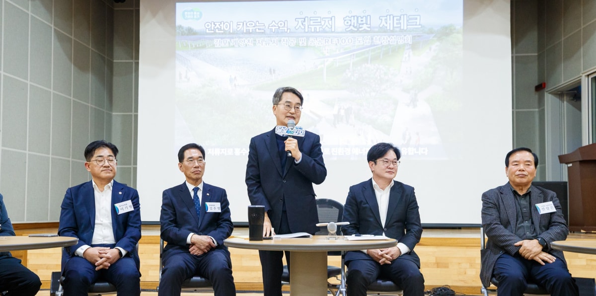 이어 "이곳 저류지 위에 태양광 패널을 설치해서 태양광 발전소로 만들겠다"며 "도민들이 조합원으로 참여해 수익을 가져가실 수 있도록 하는 사업"이라고 설명했다.