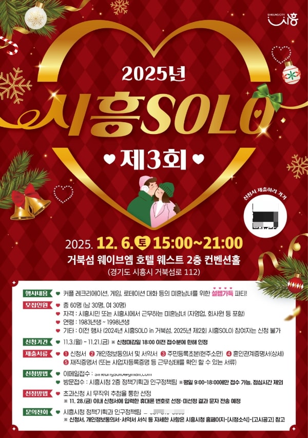시흥시가 오는 12월6일 오후 3시부터 9시까지 거북섬 웨이브엠 호텔에서 '2025년 제3회 시흥솔로(SOLO)' 행사를 개최하고, 미혼남녀 참가자를 모집한다고 밝혔다.