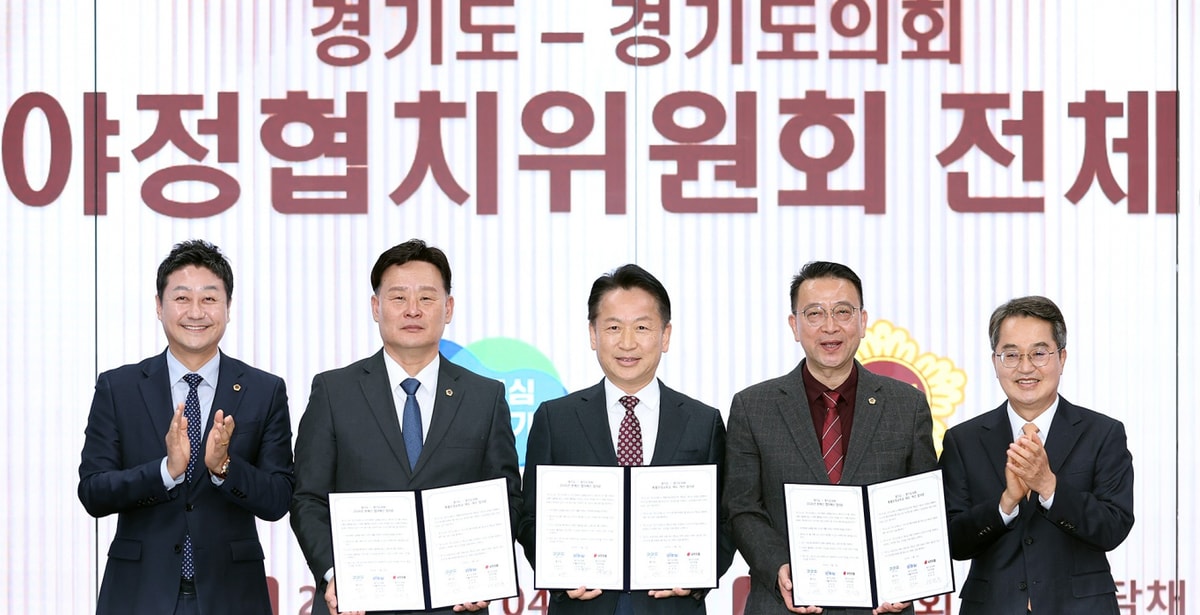 경기도와 도의회 간 소통·협치 기구 '여·야·정협치위원회'는 4일 도의회 예담채에서 개최한 '2025년 제1차 여야정협치위원회 전체회의'에서 '2026년 본예산 협치예산 합의문과 특별조정교부금 제도 개선 합의문'에 서명했다. 이날 서명에는 고영인 경기도경제부지사, 최종현 경기도의회 더불어민주당 대표, 백현종 국민의힘 경기도의회 대표가 참여했다. 김동연 경기도지사와 김진경 경기도의회 의장이 참석해 이를 환영했다.