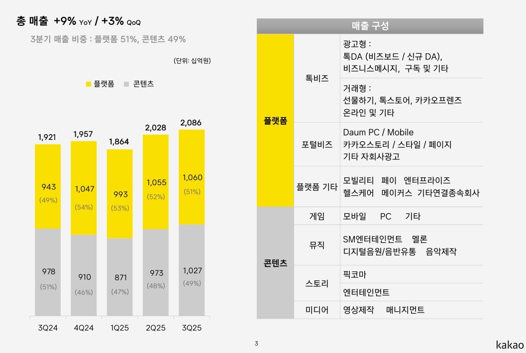 카카오는 7일 열린 2025년 3분기 실적 발표 콘퍼런스콜에서 연결 기준 매출 2조866억원, 영업이익 2080억원을 각각 기록했다고 밝혔다. 매출은 전년 동기 대비 9% 증가했고, 영업이익은 59% 늘며 최초로 2000억원을 돌파했다.