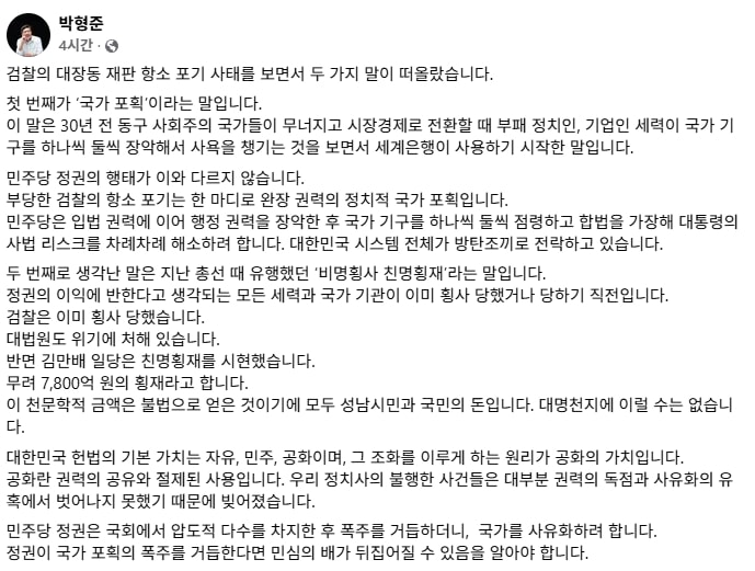 박형준 부산시장이 최근 검찰의 '대장동 개발 특혜 의혹' 관련 재판 항소 포기 사태에 대해 "정치적 국가 포획의 대표적 사례"라며 강도 높게 비판했다.