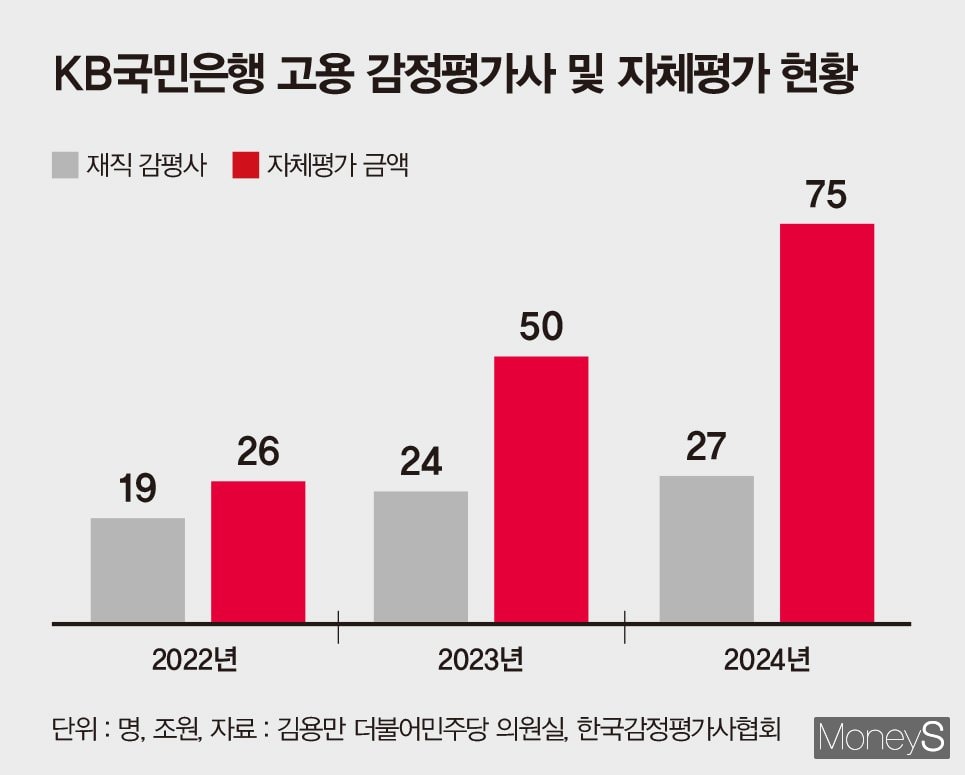국회 정무위원회 김용만(더불어민주당·경기 하남) 의원실에 따르면 국민은행이 고용한 감정평가사 수는 지난 6월 말 기준 26명이다. 국민은행의 자체평가 건수가 전체 대비 차지하는 비중은 2022년 6.9%에서 올 상반기 17.8%로 증가했다. 같은 기간 자체평가 금액 비중은 28.6%에서 44.6%로 1.7배가량 상승했다.