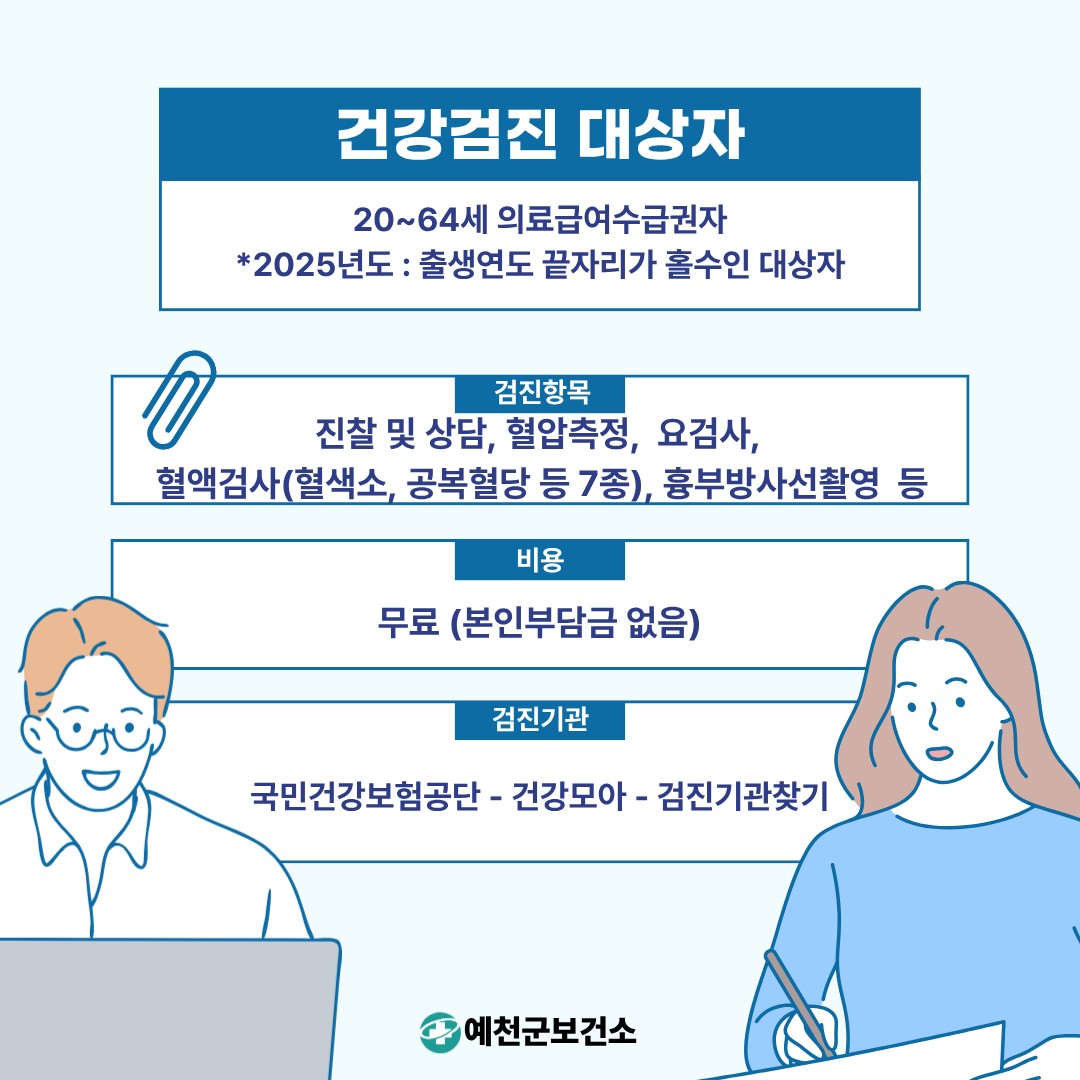 검진은 관내 권병원, 서울삼성내과의원, 영남의원, 예천성소내과의원, 경대진내과의원 등에서 받을 수 있으며 예천군 외 전국의 건강검진 지정 의료기관에서도 가능하다.