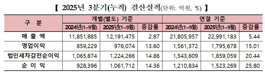 3분기 단일 분기 실적도 개선됐다. 개별 기준 매출액은 2분기 대비 3.9%, 영업이익 34.3%, 순이익 60.9% 증가했다. 연결 기준으로는 매출액 2.7%, 영업이익 33.0%, 순이익 55.5% 증가했다.