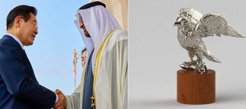 이재명 대통령이 한국-아랍에미리트(UAE) 정상회담을 마친 후 모하메드 빈 자이드 알 나하얀 UAE 대통령에게 매(팔콘) 조형물을 선물했다.