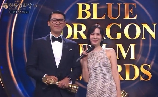 손예진은 "신랑과 함께 이렇게 상을 받아서 기쁘다. 잊지 못할 것 같다"며 "저희에게 잊지 못할 추억을 선사해주셔서 관계자 및 팬 분들께 너무 감사드린다"라며 환하게 웃었다. 또 신랑인 현빈 옆에 붙어 손가락 브이를 들어 보이는 등 사랑스러운 모습으로 훈훈함을 자아냈다.