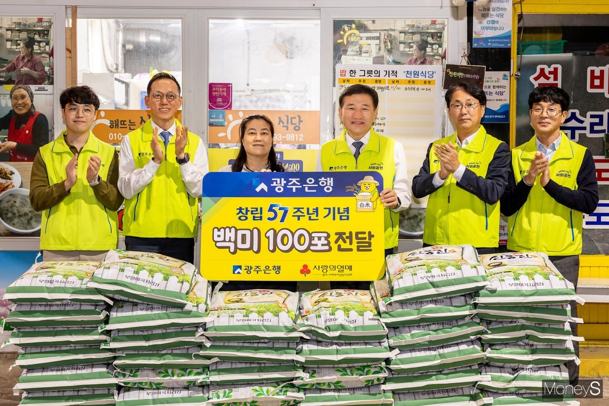 광주은행은 최근 창립 57주년(11월20일)을 맞아 광주 동구 대인시장 내 '해뜨는 식당'과 광주·전남 사회복지시설 33곳 등에 백미 총 570포대를 전달했다고 24일 밝혔다.