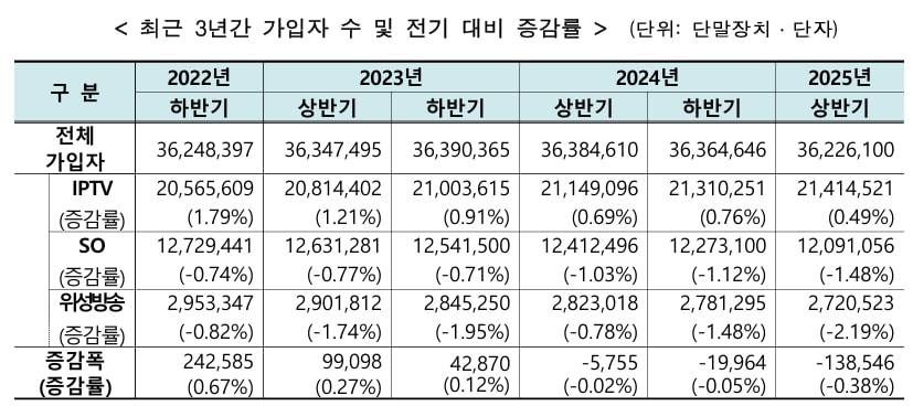 방송미디어통신위원회가 24일 발표한 '2025년도 상반기 유료방송 가입자 수와 시장점유율'에 따르면 상반기 유료방송 가입자 수는 3622만6100명으로 작년 하반기 대비 13만8546명 줄었다.
