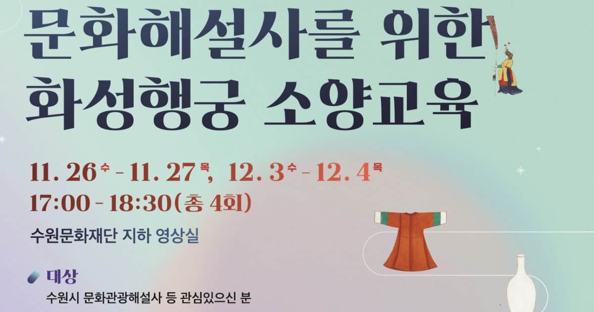 교육은 26, 27일과 12월 3, 4일 수원문화재단에서 진행된다. 수원문화재단, 수원화성박물관, 수원청소년청년재단 소속 문화해설사들이 참여하며, 유네스코 독일·한국위원회가 지원한다. 연구를 직접 수행한 전문가들이 강사로 나선다.