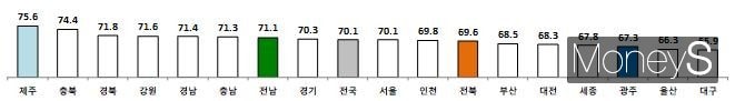 전남의 15~64세 고용률은 제주(75.6%), 충북(74.4%), 경북(71.8%), 강원(71.6%), 경남(71.4%), 충남(71.3%)에 이어 전국에서 일곱째로 높았다.