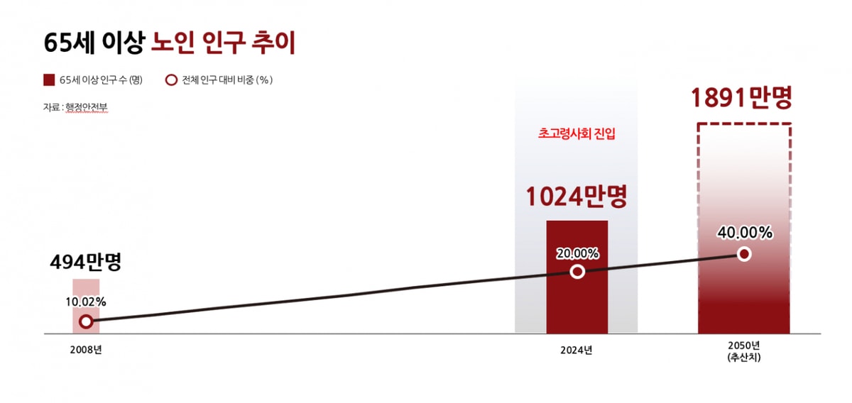 더 늙고 덜 낳는 인구 구조는 지속 불능과 기반 붕괴를 경고하고 있다. 지난해 합계 출산율은 경제협력개발기구(OECD) 평균(1.43명)에 한참 못 미치는 0.75명을 기록했다. 65세 이상 고령 인구는 지난해 1000만명을 넘어서며 전체의 20% 이상을 차지한다. 고령 인구 비중은 2050년에는 40%를 넘어설 것으로 전망되기에 생산가능인구의 급격한 감소는 피할 수 없게 됐다. 이런 상황에서 정년 연장을 요구하는 목소리도 커진다.