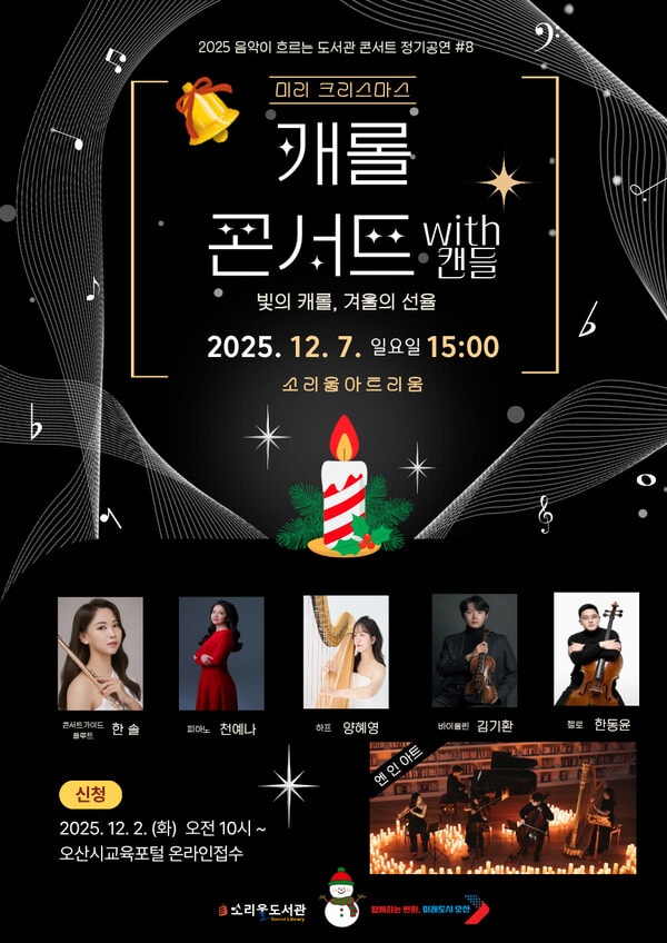 오산시(시장 이권재) 소리울도서관은 연말을 맞아 시민들에게 겨울 감성을 선사하는 '미리 크리스마스-캐롤 콘서트 with 캔들'을 다음 달 7일 오후 3시 소리울아트리움에서 개최한다고 28일 밝혔다.