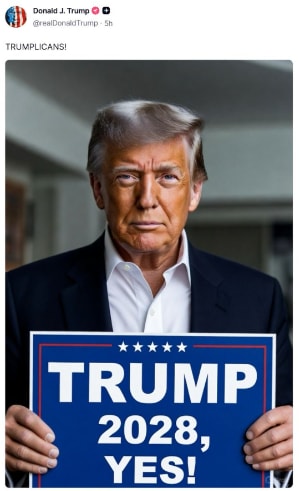 28일(현지 시간) 트럼프 대통령은 자신의 트루스소셜에 자신이 '트럼프 2028, 예스!' 문구가 적힌 피켓을 들고 있는 인공지능(AI) 생성 이미지를 게시했다.