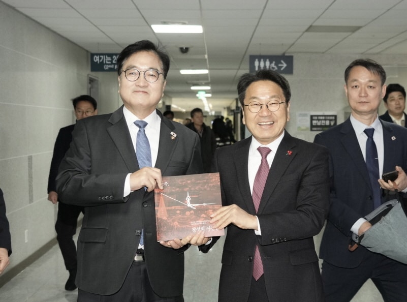 강기정 광주광역시장이 2일 국회 의원회관에서 우원식 국회의장에게 윤석열 비상계엄 선포 이후 시민사회와 광주시의 공동 대응 일지인 '광주, 광장의 시간들'을 전달하고 있다./사진=광주시