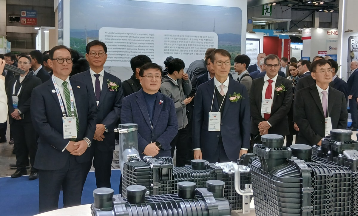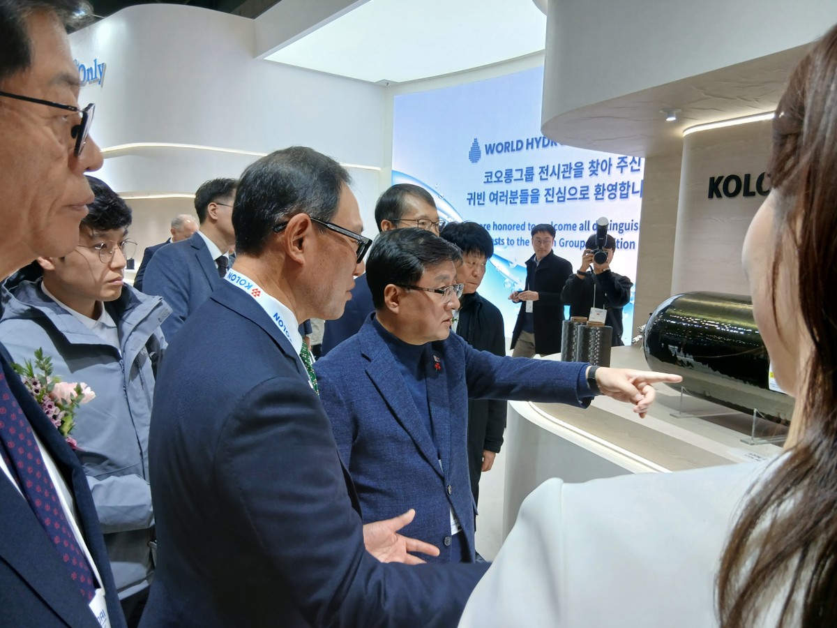 코오롱그룹 부스에도 김 장관은 방문했다. 부스에는 그룹 수소 산업 계열사인 코오롱인더스트리·코오롱ENP·코오롱스페이스웍스 제품이 비치됐다.