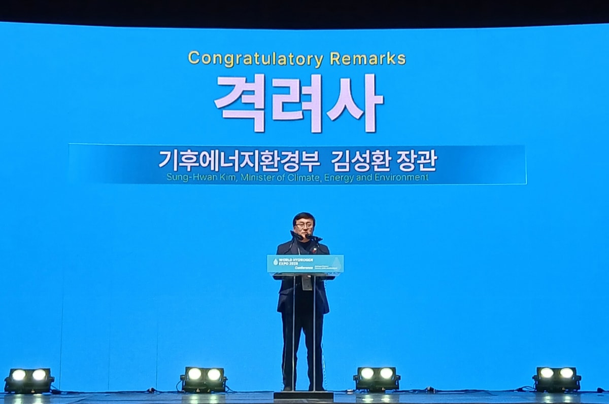 엑스포 개막식 단상에 오른 김 장관은 "전 인류가 지금 기후 위기 때문에 몸살을 앓고 있다"며 "이산화탄소 농도가 올라가서 작년에 1.5℃를 사실상 돌파했다. 이 상황으로 보면 2030년대 초반에 2℃를 돌파할 것으로 예측된다"고 포문을 열었다. 그는 "기후 위기를 막기 위해 재생 에너지로 전환해야 하는데 문제를 해결하기 위한 유력한 수단이 수소"라고 강조했다.