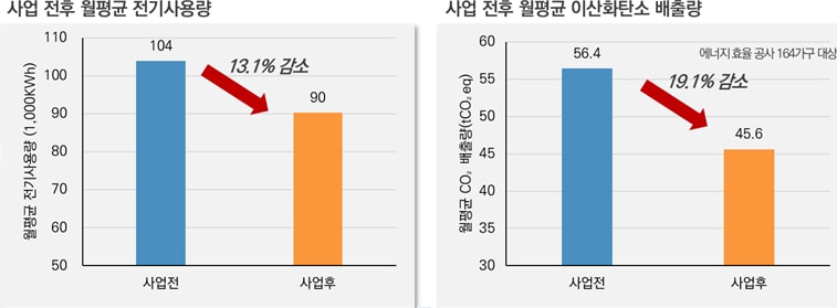 단열, 창호, 환기 설비 개선을 진행한 결과, 가구당 월평균 전기 사용량이 13.1% 감소한 것으로 조사됐다. 특히 84㎡ 기준 가구당 월평균 전기요금을 약 1만3500원(12%) 정도 절감했으며, 에너지 취약계층의 경우 여름철 냉방기기 사용 시간은 59%, 겨울철 난방기기 사용 시간은 82.4%가 줄어들어 생활비 절감 효과를 거뒀다.